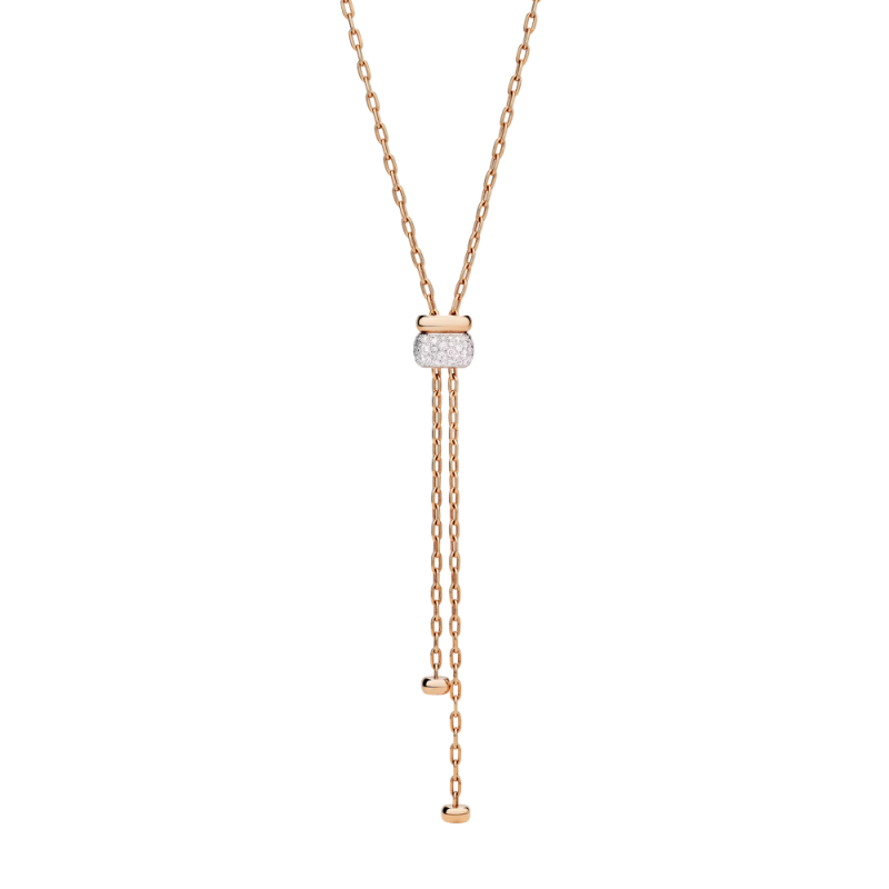 Experience the allure of Iconica - where Milanese design meets contemporary elegance, and every jewel becomes an emblem of empowerment. Each creation is a tribute to the unparalleled skills of Pomellato's master artisans, defining Iconica's uniquely powerful character. Crafted in warm rose gold and illuminated with white diamonds, this versatile lariat necklace makes a striking statement through its central motif, inspired by the harmony of paired Iconica rings - a bold band adorned with brilliant white diamonds alongside a sleek one in pure rose gold. The sliding element glides freely along the chain, offering endless styling versatility. Pomellato’s signature irregular diamond setting creates an organic, radiant pattern of light—crafted with masterful precision and artistry.