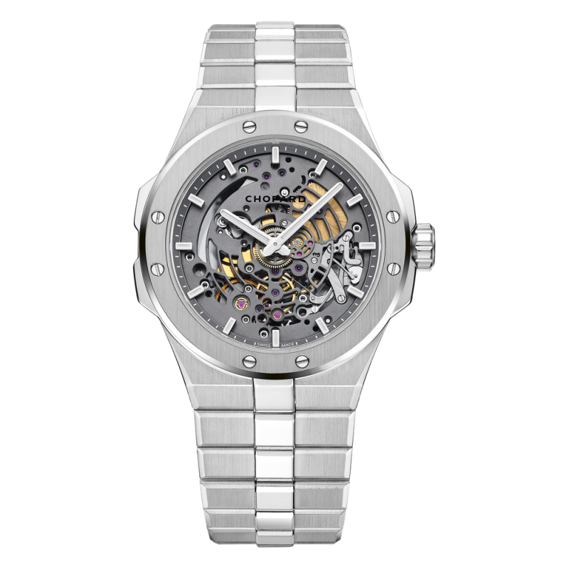The collection welcomes a new ultra-thin timepiece providing full visibility across the entire intricate mechanical workings of L.U.C Calibre 96.17-S. This movement measuring a mere 3.30 millimeters thick showcases the finest expertise and innovation cultivated within Chopard Manufacture. From the 41 mm-diameter case to the integrated bracelet, the Alpine Eagle 41 XP TT is entirely made in Chopard's workshops from grade 5 titanium, an extremely light metal boasting tried and tested resistance. Its optimal proportions and modernist design infuse this model with an undeniably technical character, while remaining faithful to the collection's sporty aesthetic.