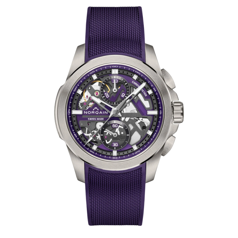 Dial Satin-finished skeletonised black and purple dial White minute scale on a purple outer ring Black counters at 6 and 12 o’clock White NORQAIN logo Diamond-cut flat indexes, rhodium plated, filled with white X1 Super-LumiNova® Diamond-cut faceted hour and minute hands, rhodium plated, filled with white X1 Super-LumiNova® Diamond-cut flat central chronograph hand, rhodium plated, filled with white X1 Super-LumiNova® Diamond-cut faceted small counter hands, rhodium plated