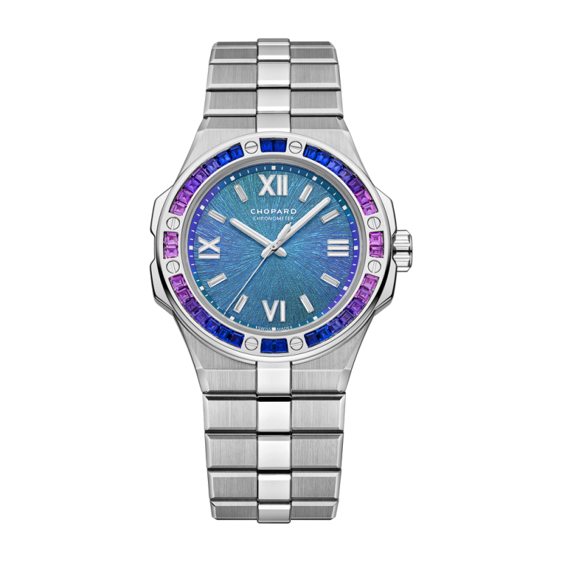 The Alpine Eagle collection welcomes a new series of 36 mm-diameter models adorned with dials in luminous shades and bezels set with a gemstone gradient. Crafted in 18-carat ethical white gold, its bezel is set with trapeze-cut blue and purple sapphires. As technically advanced as it is aesthetically pleasing, this model is equipped with Chopard's 09.01-C automatic movement and a 42-hour power reserve