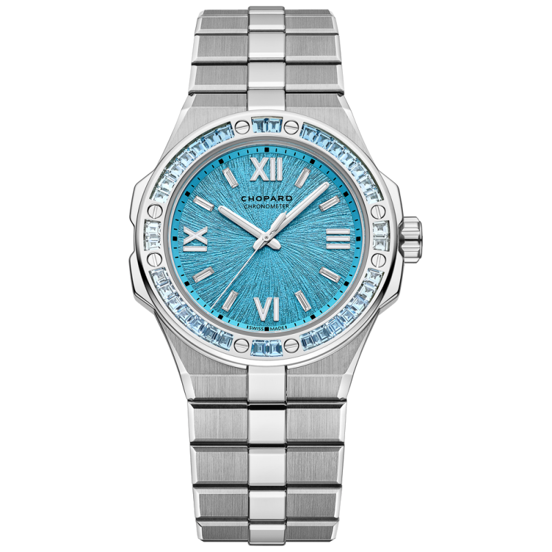 The Alpine Eagle collection welcomes a new series of 36 mm-diameter models adorned with dials in luminous shades and bezels set with a gemstone gradient. Crafted in 18-carat ethical white gold, its bezel is set with trapeze-cut topazes. As technically advanced as it is aesthetically pleasing, this model is equipped with Chopard's 09.01-C automatic movement and a 42-hour power reserve.