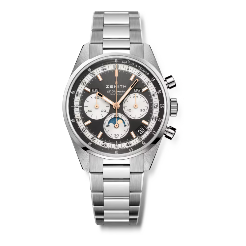 La montre CHRONOMASTER Original Triple Calendar possède un boîtier en acier de 38 mm avec un bracelet en acier, associé à un cadran gris ardoise soleillé affichant le jour, la date, le mois et les phases de la Lune. Elle est animée par le mouvement de chronographe automatique haute fréquence El Primero 3610 avec fonction chronographe affichant les 1/10e de seconde et réserve de marche de 60 heures.