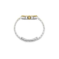 Boîtier et cadran Métal: Or jaune 18 carats et acier inoxydable Diamètre de la boîte: 33 Epaisseur: 7.95 mm Cadran: Cadran en laiton embossé d'un motif rayonnant inspiré de l'iris des aigles, de couleur « Gris de Vals » Étanchéité: 50 mètres Fond: glace saphir Materiau de la couronne: Or jaune éthique 18 carats Type de couronne: vissée Glace: Glace saphir